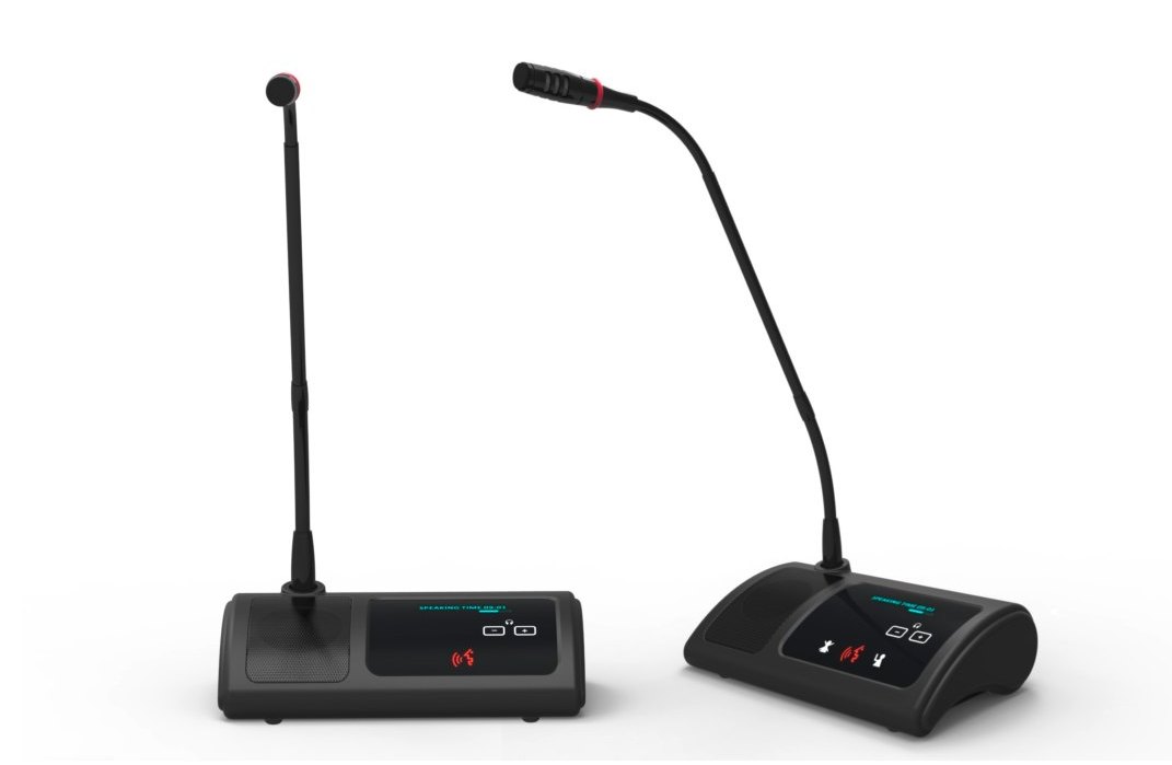 - „APPLY“ Mode: Bei Betätigung der Sprechtaste an einer Sprechstelle wird eine Aktivierungsanfrage eingeleitet. Das Mikrofon der Sprechstelle leuchtet grün und an der Präsidentensprechstelle wird angezeigt, dass eine Aktivierungsanfrage vorliegt. Der Präsident kann diese annehmen oder ablehnen. Wenn der Präsident die Aktivierungsanfrage annimmt, leuchtet das Mikrofon der betroffenen Sprechstelle rot und das Mikrofon ist aktiv.