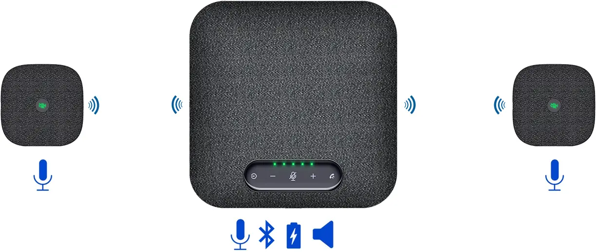 Konferenzraum Mikrofon mit Echo Unterdrückung, lautstarken HiFi Lautsprecher und 6 wireless Mikrofone. Vier Mikrofone befinden sich im Hauptgerät das auch als Lade-Docking-Station für beide Erweiterungsmikrofone dient. Mit den zusätzlichen zwei Erweiterungsmikrofonen kommt man so auf 6 Mikrofone für Online Meetings.